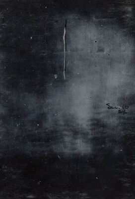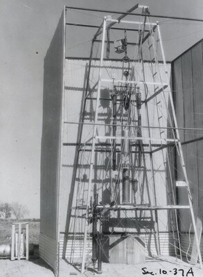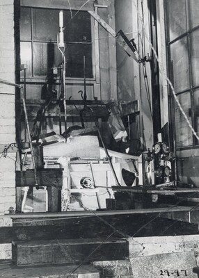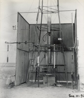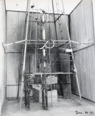 • [016] Inside sheet iron shelter at Clark University, first test of liquid propelled rocket lifting its own weight, December 6, 1925 by Esther C. Goddard
