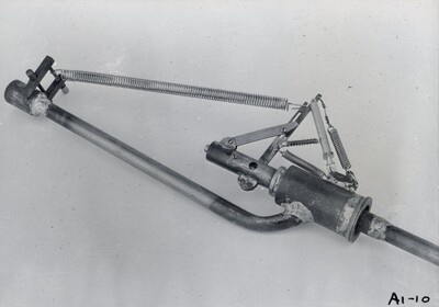 Photograph of "final form of pressure valve, January 1935" (annotation by Esther Goddard). From September 1934 through October 1935, Robert Goddard and his crew conducted what they named their 'A' series of tests in Roswell, New Mexico. The 'A' series of tests used simple pressure feed, gyroscopic control using vanes, and parachutes. The rockets in this series averaged in length from 13 feet 6 inches to 15 feet 3/4 inches; their weight empty varied from 58 to 85 pounds. Those tests can be seen in the Reel 5 of The Goddard Rocket Film Reels. Robert and Esther lived in Roswell, New Mexico from 1934 to 1942; he conducted research and experiments with rocketry with grant funding provided by the Guggenheim Foundation.