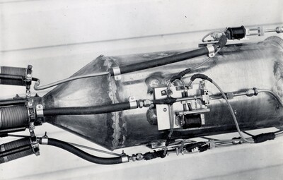Photograph of "magnet and bellows mounting, January 1935" (annotation by Esther Goddard). From September 1934 through October 1935, Robert Goddard and his crew conducted what they named their 'A' series of tests in Roswell, New Mexico. The 'A' series of tests used simple pressure feed, gyroscopic control using vanes, and parachutes. The rockets in this series averaged in length from 13 feet 6 inches to 15 feet 3/4 inches; their weight empty varied from 58 to 85 pounds. Those tests can be seen in the Reel 5 of The Goddard Rocket Film Reels. Robert and Esther lived in Roswell, New Mexico from 1934 to 1942; he conducted research and experiments with rocketry with grant funding provided by the Guggenheim Foundation.