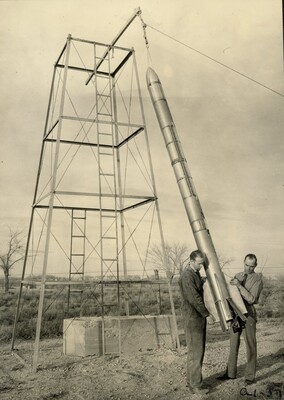 Photograph of "Tilting rocket to test vane operation for automatic stabilization, January 1935" (annotation by Esther Goddard). From September 1934 through October 1935, Robert Goddard and his crew conducted what they named their 'A' series of tests in Roswell, New Mexico. The 'A' series of tests used simple pressure feed, gyroscopic control using vanes, and parachutes. The rockets in this series averaged in length from 13 feet 6 inches to 15 feet 3/4 inches; their weight empty varied from 58 to 85 pounds. Those tests can be seen in the Reel 5 of The Goddard Rocket Film Reels. Robert and Esther lived in Roswell, New Mexico from 1934 to 1942; he conducted research and experiments with rocketry with grant funding provided by the Guggenheim Foundation.