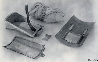 Photograph of "Parachute and box, January 1935" (annotation by Esther Goddard). From September 1934 through October 1935, Robert Goddard and his crew conducted what they named their 'A' series of tests in Roswell, New Mexico. The 'A' series of tests used simple pressure feed, gyroscopic control using vanes, and parachutes. The rockets in this series averaged in length from 13 feet 6 inches to 15 feet 3/4 inches; their weight empty varied from 58 to 85 pounds. Those tests can be seen in the Reel 5 of The Goddard Rocket Film Reels. Robert and Esther lived in Roswell, New Mexico from 1934 to 1942; he conducted research and experiments with rocketry with grant funding provided by the Guggenheim Foundation.