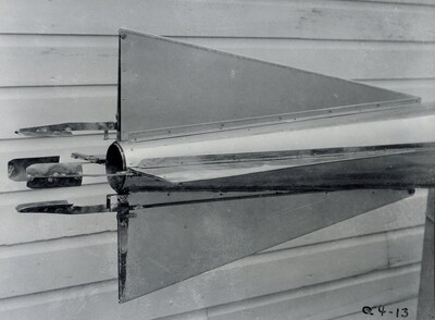 Photograph of the "tail piece for rocket with blast vanes, used in flight March 8 1935" (annotation by Esther Goddard). The March 8th, 1935 test (aka A4) was a significant flight, as it marked the first liquid-rocket fuel flight to attain a speed close to or at the speed of sound. For this flight, Robert Goddard went back to using a blast-vane steering mechanism rather than a gyroscope. It is described by Esther Goddard and G. Edward Pendray in The Papers of Robert Goddard appendices as: