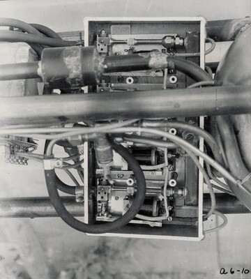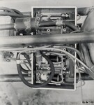 A close-up photograph of the "magnet valve box, installed for test of April 19 1935" (annotation by Esther Goddard). From September 1934 through October 1935, Robert Goddard and his crew conducted what they named their 'A' series of tests in Roswell, New Mexico. The 'A' series of tests used simple pressure feed, gyroscopic control using vanes, and parachutes. These materials belong to the 'A6' test, which can be seen from 07:02 to 07:15 on Reel 5 of The Goddard Rocket Film Reels.