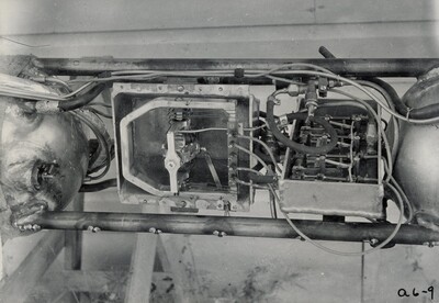 A close-up photograph of the "parts between oxygen and pressure tanks, April 19, 1935" (annotation by Esther Goddard). From September 1934 through October 1935, Robert Goddard and his crew conducted what they named their 'A' series of tests in Roswell, New Mexico. The 'A' series of tests used simple pressure feed, gyroscopic control using vanes, and parachutes. These materials belong to the 'A6' test, which can be seen from 07:02 to 07:15 on Reel 5 of The Goddard Rocket Film Reels.