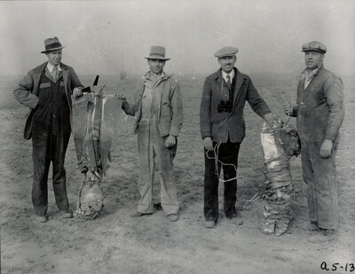 Photograph of "Rocket after flight of March 28, 1935, which made a hole where it hit about 8" deep and 1 1/2 ft. in diameter" (annotation by Esther Goddard. Pictures left to right with the rocket are Charles Mansur (welder), Nils T. Ljungquist (machinist), Robert Goddard, and Albert Kisk (machinist and brother-in-law).