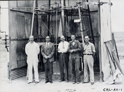 Photograph taken by Charles Lindbergh of Albert Kisk (machinist and brother-in-law), Harry Guggenheim, Robert Goddard, Charles Mansur (welder), and Nils T. Ljungquist (machinist) next to the launching tower on September 23, 1935. This section of Esther's photo album is titled 'A Series of Ten Photographs Taken By Charles A. Lindbergh On Occasion of His Visit to Roswell with Harry F. Guggenheim, September 23, 1935'.