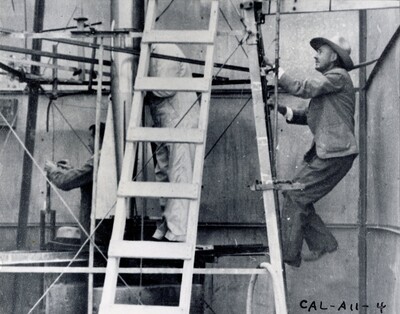 Photograph taken by Charles Lindbergh of Robert Goddard on a ladder, preparing a rocket for test, September 23, 1935. This section of Esther's photo album is titled 'A Series of Ten Photographs Taken By Charles A. Lindbergh On Occasion of His Visit to Roswell with Harry F. Guggenheim, September 23, 1935'.