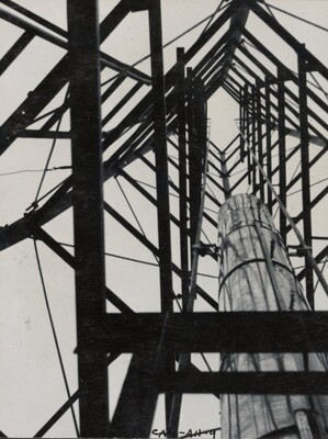Photograph taken by Charles Lindbergh looking up the launching tower alongside the rocket on September 23, 1935. This section of Esther's photo album is titled 'A Series of Ten Photographs Taken By Charles A. Lindbergh On Occasion of His Visit to Roswell with Harry F. Guggenheim, September 23, 1935'.