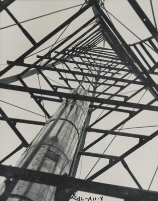 Photograph taken by Charles Lindbergh looking up the launching tower alongside the rocket on September 23, 1935. This section of Esther's photo album is titled 'A Series of Ten Photographs Taken By Charles A. Lindbergh On Occasion of His Visit to Roswell with Harry F. Guggenheim, September 23, 1935'.