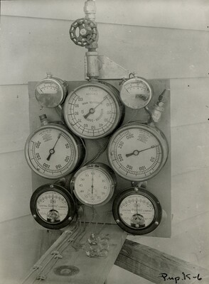 Photograph of the "final form of instrument board, Fall 1935" (annotation by Esther Goddard). Between November 22, 1935 and February 12, 1936, Goddard and his team conducted a series of ten static tests that were named the 'K' Series. This was a series of ten proving-stand tests for the development of a more powerful motor, 10 inches in diameter. In Reel 7 of The Goddard Rocket Film Reels, 00:00 - 04:01 shows how one of these static tests is carried out. Then, 04:01 - 06:44 shows the 'K' series of tests.