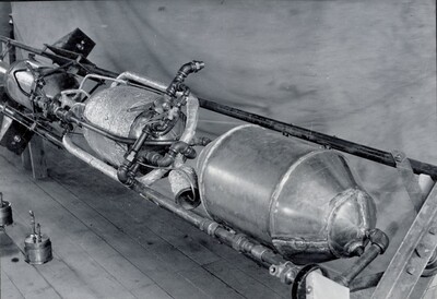 Photograph of the "top view of assembled rocket static-tested, November 22, 1935" (annotation by Esther Goddard). Between November 22, 1935 and February 12, 1936, Goddard and his team conducted a series of ten static tests that were named the 'K' Series. This was a series of ten proving-stand tests for the development of a more powerful motor, 10 inches in diameter. In Reel 7 of The Goddard Rocket Film Reels, 00:00 - 04:01 shows how one of these static tests is carried out. Then, 04:01 - 06:44 shows the 'K' series of tests.