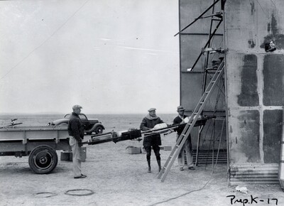 Photograph of Robert Goddard and his team "placing rocket in tower for static test, Winter 1935-1936" (annotation by Esther Goddard). Between November 22, 1935 and February 12, 1936, Goddard and his team conducted a series of ten static tests that were named the 'K' Series. This was a series of ten proving-stand tests for the development of a more powerful motor, 10 inches in diameter. In Reel 7 of The Goddard Rocket Film Reels, 00:00 - 04:01 shows how one of these static tests is carried out. Then, 04:01 - 06:44 shows the 'K' series of tests.