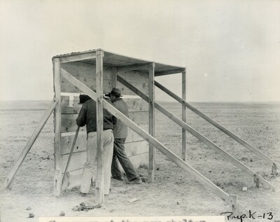Photograph of "Observers at the new shelter 140 feet from tower for static tests, Winter 1935-1936" (annotation by Esther Goddard). Between November 22, 1935 and February 12, 1936, Goddard and his team conducted a series of ten static tests that were named the 'K' Series. This was a series of ten proving-stand tests for the development of a more powerful motor, 10 inches in diameter. In Reel 7 of The Goddard Rocket Film Reels, 00:00 - 04:01 shows how one of these static tests is carried out. Then, 04:01 - 06:44 shows the 'K' series of tests.