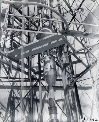 A closeup photograph of a rocket tested on May 11, 1936. Between May 11, 1936 and August 9, 1838, Robert Goddard conducted the L-Series of tests in Roswell, New Mexico. Goddard and his wife Esther lived in Roswell from 1930 to 1932 and 1934 to 1942 as a result of Guggenheim-funded grants, allowing Goddard to conduct his research and experiments with rocketry. The L-Series consisted of thirty flight tests divided into three sections (A; L1-L7; B; L8-L15; C; L16-L30) testing ten-inch diameter motors in nitrogen-pressured rockets. Seventeen of these tests were flights tests, while the other thirteen were static tests. The L-Series tackled a range of variables and challenges that came with building larger rockets. Reel 8 of The Goddard Rocket Film Reels contains 22 minutes of footage from the 'L' tests.