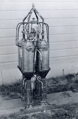 Photograph of a four-chamber unit that was tested November 7, 1936. Between May 11, 1936 and August 9, 1838, Robert Goddard conducted the L-Series of tests in Roswell, New Mexico. Goddard and his wife Esther lived in Roswell from 1930 to 1932 and 1934 to 1942 as a result of Guggenheim-funded grants, allowing Goddard to conduct his research and experiments with rocketry. The L-Series consisted of thirty flight tests divided into three sections (A; L1-L7; B; L8-L15; C; L16-L30) testing ten-inch diameter motors in nitrogen-pressured rockets. Seventeen of these tests were flights tests, while the other thirteen were static tests. The L-Series tackled a range of variables and challenges that came with building larger rockets. Reel 8 of The Goddard Rocket Film Reels contains 22 minutes of footage from the 'L' tests.
