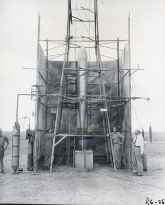 Photograph of "rocket ready for test of October 3, 1936, giving short flight" (annotation by Esther Goddard). Between May 11, 1936 and August 9, 1838, Robert Goddard conducted the L-Series of tests in Roswell, New Mexico. Goddard and his wife Esther lived in Roswell from 1930 to 1932 and 1934 to 1942 as a result of Guggenheim-funded grants, allowing Goddard to conduct his research and experiments with rocketry. The L-Series consisted of thirty flight tests divided into three sections (A; L1-L7; B; L8-L15; C; L16-L30) testing ten-inch diameter motors in nitrogen-pressured rockets. Seventeen of these tests were flights tests, while the other thirteen were static tests. The L-Series tackled a range of variables and challenges that came with building larger rockets. Reel 8 of The Goddard Rocket Film Reels contains 22 minutes of footage from the 'L' tests.