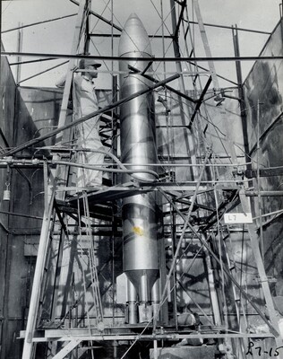 A closeup photograph of the four-chamber rocket in the launching tower on November 7, 1936. This test resulted in a short flight. Between May 11, 1936 and August 9, 1838, Robert Goddard conducted the L-Series of tests in Roswell, New Mexico. Goddard and his wife Esther lived in Roswell from 1930 to 1932 and 1934 to 1942 as a result of Guggenheim-funded grants, allowing Goddard to conduct his research and experiments with rocketry. The L-Series consisted of thirty flight tests divided into three sections (A; L1-L7; B; L8-L15; C; L16-L30) testing ten-inch diameter motors in nitrogen-pressured rockets. Seventeen of these tests were flights tests, while the other thirteen were static tests. The L-Series tackled a range of variables and challenges that came with building larger rockets. Reel 8 of The Goddard Rocket Film Reels contains 22 minutes of footage from the 'L' tests.
