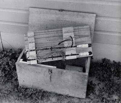 Photograph of an igniter box with the igniters in grooves on the board, used in an April 22, 1937 test flight. This flight, known as L14, attempted to build off of the successful L13 test flight by incorporating larger movable air vanes and a reinforced parachute. The L14 test did not have the success of L13.