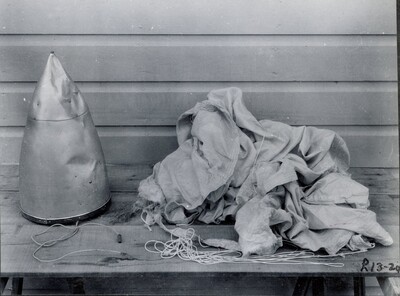 Goddard, Esther C., "[168] Dented nose cone and torn parachute after flight of March 26 1937" (1937). The Goddard Rocket Researches: A Photographic Record [Individual Photographs]. 169.