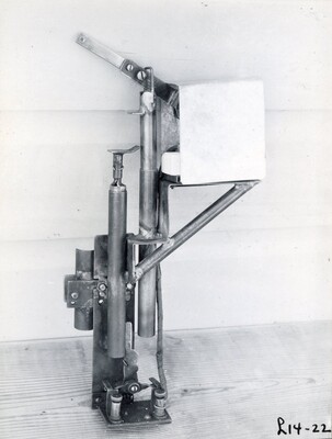 Photograph of a lift indicator clamped to the launching tower, associated with a test flight from April 22, 1937. This flight, known as L14, attempted to build off of the successful L13 test flight by incorporating larger movable air vanes and a reinforced parachute. The L14 test did not have the success of L13.