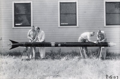 Photograph of Robert Goddard's team working on the rocket used for flight test L15 on May 19, 1937. This photograph shows that half of the rocket is painted black. The rocket for this test had streamlined retractable air vanes and a wire-wound pressure storage tank. This flight saw improved stabilization and an altitude of 3,250 feet.