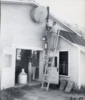 Photograph taken outside Robert Goddard's workshop in Roswell, New Mexico. It shows Goddard staff performing "setup for test of nitrogen pump and motor, with oxygen jacket around nitrogen tank" (annotation by Esther Goddard). This equipment was used for the L18 test in Goddard's L-Series. Following the relative successes of L16 and L17, Goddard changed his designs in an attempt to increase propellant pressure. To do this, he tried using a bellows pump to drive the liquid nitrogen. Failing that, he switched back to gaseous nitrogen. Following L17, the L-Series of tests would not produce satisfactory results until L27.
