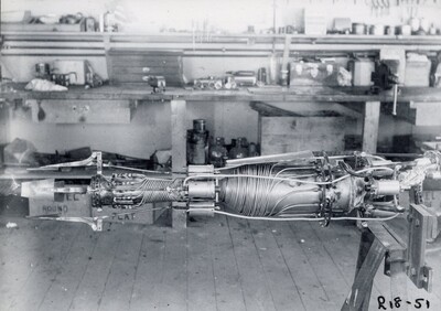 Photograph taken in Goddard's workshop of a "rocket motor with spiral copper tube jacket, blast vanes, and one retractable air vane" (annotation by Esther Goddard). This equipment was used for test L18 in Robert Goddard's L-Series. Following the relative successes of L16 and L17, Goddard changed his designs in an attempt to increase propellant pressure. To do this, he tried using a bellows pump to drive the liquid nitrogen. Failing that, he switched back to gaseous nitrogen. Following L17, the L-Series of tests would not produce satisfactory results until L27.