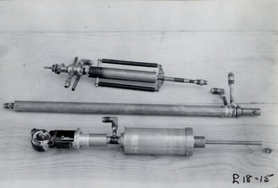 Photograph of a "bellows engine, high-pressure engine valve, and regulator, October 19 1937" (annotation by Esther Goddard). This equipment was used in test L18 in Robert Goddard's L-Series. Following the relative successes of L16 and L17, Goddard changed his designs in an attempt to increase propellant pressure. To do this, he tried using a bellows pump to drive the liquid nitrogen. Failing that, he switched back to gaseous nitrogen. While all of the L-Series tests resulted in flights, following L17 they would not produce satisfactory results until L27.
