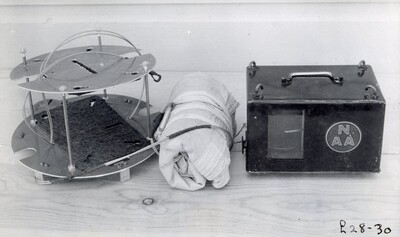 Photograph of an official NAA barograph, mounting, and parachute used for flight test L28 on April 20, 1938. Benefactors and sponsors Charles Lindbergh and Harry Guggenheim wanted to get a high-altitude flight on record by the National Aeronautics Association (NAA), official record keeper in the field. The NAA sent their official barograph, pictured here, while New Mexico Military Institute superintendent Colonel D.C Pearson chaired a committee of observers. While the flight was a success, reaching an altitude of 4,215 feet according to the recording telescope, the barograph did not survive the flight. This prevented the flight from being verified by the NAA.