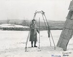 Photograph of Robert Goddard looking up at "the empty frame, after world's first flight of a liquid-propelled rocket, March 16, 1926" (annotation by Esther Goddard). This still was taken from a piece of 16mm film that Esther shot (Robert bought his wife a movie camera earlier that year). Esther would often extract still images from her own footage. The footage this still comes from can be seen here, as part of our The Goddard Rocket Film Reels. While the flight itself was not captured by photograph or on film (due to a delay in lift-off and having mere seconds of available footage to shoot), Esther was able to record moments before the flight, assistant Henry Sachs igniting the rocket, and after the flight.
