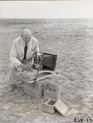 Photograph of Robert Goddard crouching down with a "relay-operated camera mounted to be fixed at any inclination, located between (launching) tower and 140-foot shelter, April 1938" (annotation by Esther Goddard). This photograph is associated with flight test L28 which was held on April 20, 1938. Benefactors and sponsors Charles Lindbergh and Harry Guggenheim wanted to get a high-altitude flight on record by the National Aeronautics Association (NAA), official record keeper in the field. The NAA sent their official barograph, pictured here, while New Mexico Military Institute superintendent Colonel D.C Pearson chaired a committee of observers. While the flight was a success, reaching an altitude of 4,215 feet according to the recording telescope, the barograph did not survive the flight. This prevented the flight from being verified by the NAA.