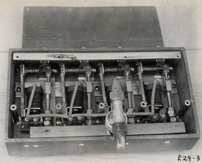 Photograph of "magnet-controlled valve assembly, May 26, 1938" (annotation by Esther Goddard). This equipment was used in test flight L29.