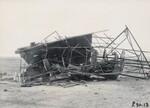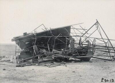Photograph of the launching tower, with the rocket inside, destroyed after a tornado hit the morning of June 15, 1938. Test L30 was supposed to take place the day before but high winds prevented that. The tower was rebuilt 20 feet taller.
