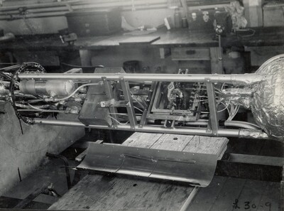 Goddard, Esther C., "[219] Parts between oxygen tank and combustion chamber with oxygen tank, gyroscope, valve box, and pressure tank, August 9 1938" (1938). The Goddard Rocket Researches: A Photographic Record [Individual Photographs]. 221.