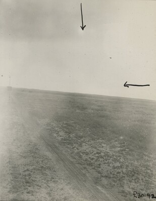 Photograph showing the L30 rocket descending with its open parachute. Esther Goddard has drawn arrows on the photograph to illustrate its location. This test took place on August 9, 1938.