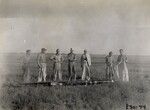 Photograph showing, from left to right, 'Hagg', Albert Kisk (machinist and brother-in-law), Nils T. Ljungquist (machinist), Charles Mansur (welder), Robert Goddard, Marjorie Alden, and Captain Howard Alden. The Aldens were both on the National Aeronautics Committee. They all stand with the rocker following the L30 test flight which took place on August 9, 1938.