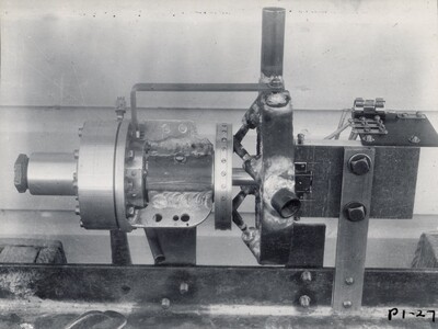 By 1938, Robert Goddard felt he had covered everything needed for successful high-flying rockets -- except for a turbine that could drive high-speed pumps to force propellants into the chamber. This would define his work over the next several years. This test, P1, was the first in the P-Series of tests Goddard would conduct from January 1939 into October of 1941, consisting of a variety of flight and static tests developing high-speed centrifugal turbine-driven pumps for liquid propellant rockets. P1-P4 used two pump models that had been tested during the preceding months to conduct four proving-stand tests. The results from P1-P4 concluded that a small chamber, or gas generator, producing warm oxygen gas should be developed for a successful turbine. The development of this gas generator would make up tests P5-P12. The P-Series of tests can be seen in Reel 9 and Reel 10 of The Goddard Rocket Film Reels.