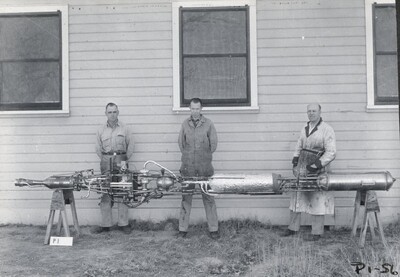 Photograph of Nils T. Ljungquist (machinist), Charles Mansur (welder), and Albert Kisk (machinist and brother-in-law) standing behind the completed rocket used for the P1 test, Robert Goddard's first with pumps and turbines. The P1 test took place on January 6 1939.