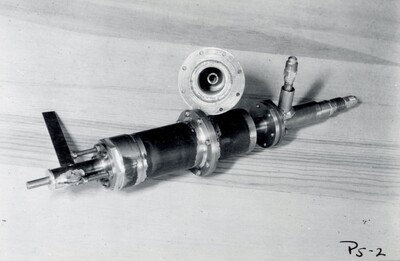 Photograph of a "small chamber to evaporate and warm sufficient oxygen to operate two pump turbines using gasoline and oxygen" (annotation by Esther Goddard). This piece was used in the P5 test which took place on May 18, 1939. This was the first of eight static tests. Robert Goddard spent March 24 through April 18th of that year developing a gas generator for the P-Series of tests. This gas generator was developed through a subseries of tests called P5a-k.
