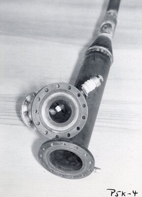 Photograph of a "small chamber to evaporate and warm sufficient oxygen to operate two pump turbines using gasoline and oxygen, April 25, 1939" (annotation by Esther Goddard). Goddard spent March 24 through April 18th of that year developing a gas generator for the P-Series of tests. This gas generator was developed through a subseries of tests called P5a-k.