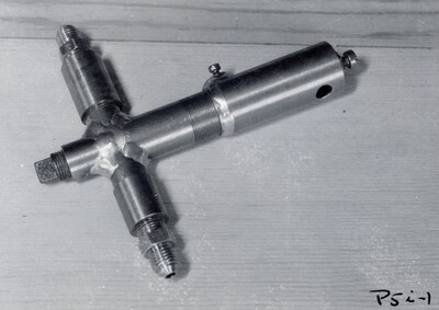 Photograph showing a new automatic shut-off valve from April 25, 1939. Robert Goddard spent March 24 through April 18th of that year developing a gas generator for the P-Series of tests. This gas generator was developed through a subseries of tests called P5a-k.