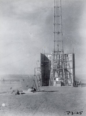 Photograph showing test P3, which took place on February 7, 1939. The flame is visible above the cement gas deflector but there is no smoke at the rear.