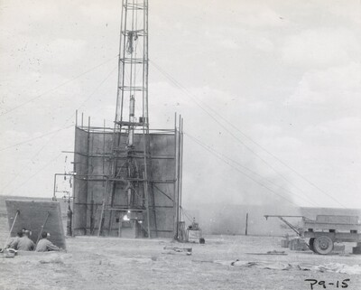 Photograph of static test P9, which took place on July 5, 1939. In the annotation of her photo album, Esther Goddard notes the intense flame and dust at the rear.