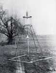 Photograph of a "rocket with additional vertical braces, April 3, 1926, which also gave a flight" (annotation by Esther Goddard). This rocket marked the world's second ever flight of a liquid-propellant rocket. It was in the air for 4.2 seconds and landed 50 feet from the testing stand.