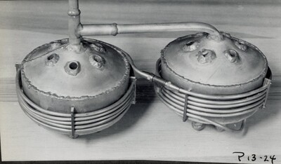 Photograph of a "liquid nitrogen tank, to be installed in liquid oxygen tank" (annotation by Esther Goddard). This piece was used in the P13 test which took place on November 18, 1939. This test was held up by an oxygen valve that froze.