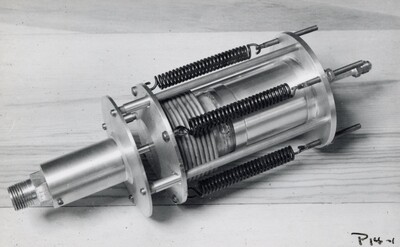 Photograph of a new large capacity safety valve to vent oxygen tank" (annotation by Esther Goddard). This piece was used in the P14 test which took place on December 2, 1939. The results of this test convinced Robert Goddard to begin attempting flight tests in the P-Series. He noted that the lift on this test lasted 40 seconds (lifting 760 pounds) with very steady pressures.