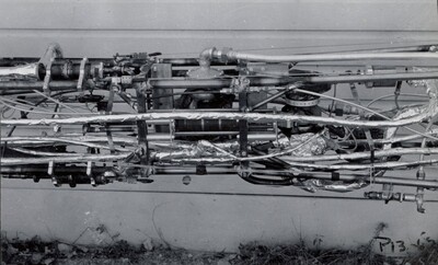 Photograph of an "...gas generator parts between oxygen tank and main valves" (annotation by Esther Goddard; the first couple of words are obscured by the photograph). This piece was used in the P13 test which took place on November 18, 1939. This test was held up by an oxygen valve that froze.