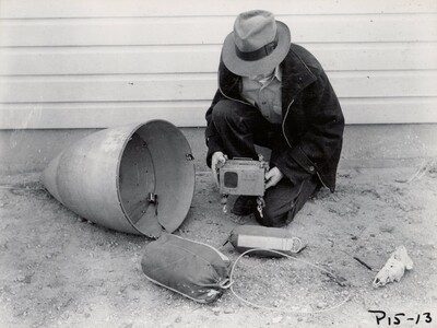 Photograph of someone crouching next to a cap, parachutes, and barograph used in the P15 rocket. The P15 flight test took place on February 9, 1940. It was the first attempted flight test in the P-Series. Between this test being the first rocket flight ever attempted with fuel-fed pumps, and feeling confident about the test's success, Robert Goddard invited his world-famous patron Charles Lindbergh, Harry and Alicia Guggenheim, photographers from National Geographic, and NAA (National Aeronautic Association) observers (hoping to get the flight on official record) to watch. Snow, ice, and rain prevented the test from being performed for ten days following the guests' arrivals. The rocket was in the tower during that time. When they finally performed the test, clogging due to ice caused the oxygen pump to blow apart and shred the rest of the rocket.