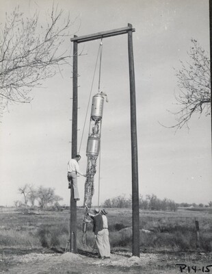 Photograph of Robert Goddard and his staff draining and drying a pump-fed rocket after using it for the P14 static test on December 2 1939. The results of this test convinced Robert Goddard to begin attempting flight tests in the P-Series. He noted that the lift on this test lasted 40 seconds (lifting 760 pounds) with very steady pressures.