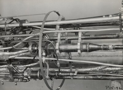 Photograph of the "gas generator and neighboring parts" (annotation by Esther Goddard) on the rocket used for test flight P15 which took place February 9, 1940. This was the first attempted flight test in the P-Series. Between this test being the first rocket flight ever attempted with fuel-fed pumps, and feeling confident about the test's success, Robert Goddard invited his world-famous patron Charles Lindbergh, Harry and Alicia Guggenheim, photographers from National Geographic, and NAA (National Aeronautic Association) observers (hoping to get the flight on official record) to watch. Snow, ice, and rain prevented the test from being performed for ten days following the guests' arrivals. The rocket was in the tower during that time. When they finally performed the test, clogging due to ice caused the oxygen pump to blow apart and shred the rest of the rocket.